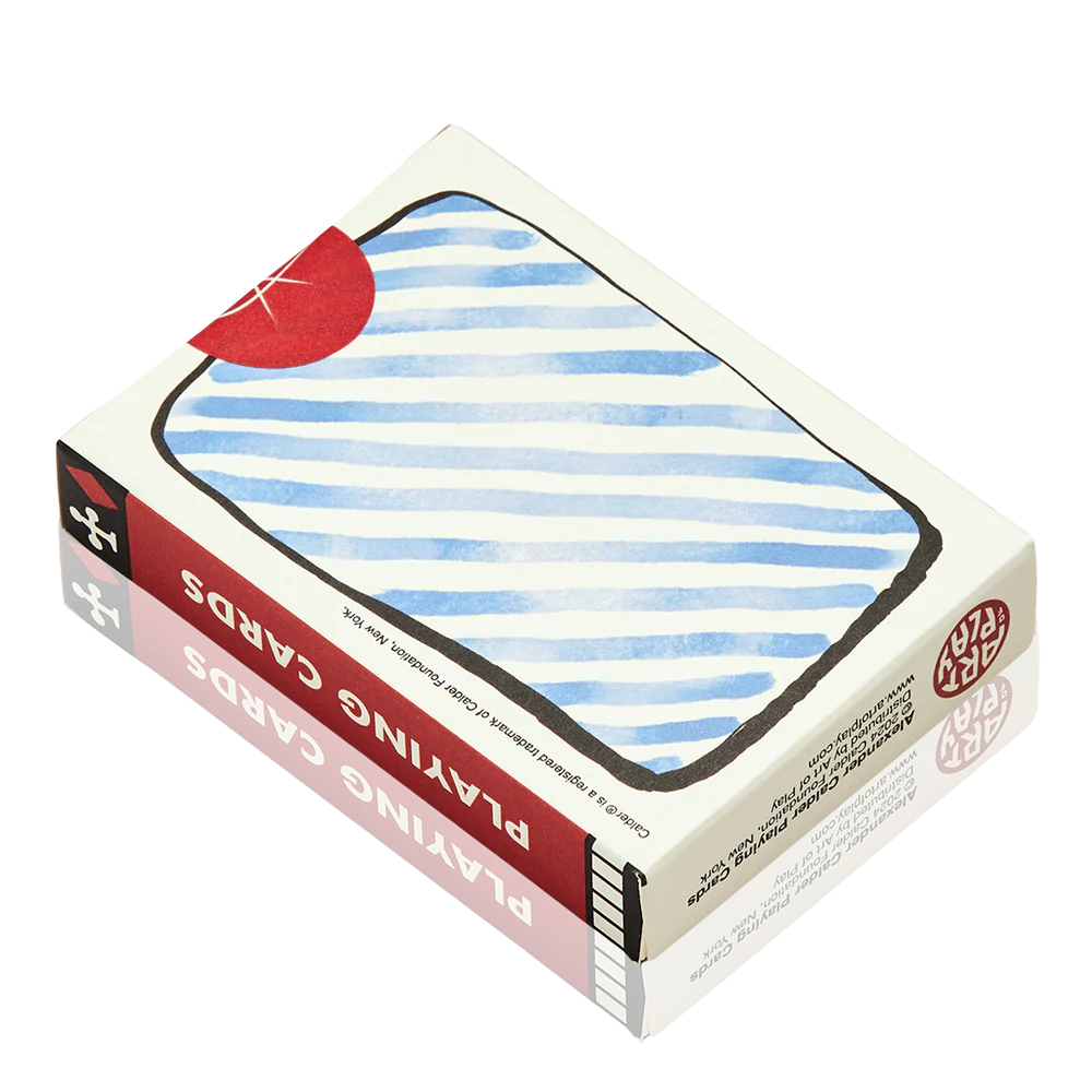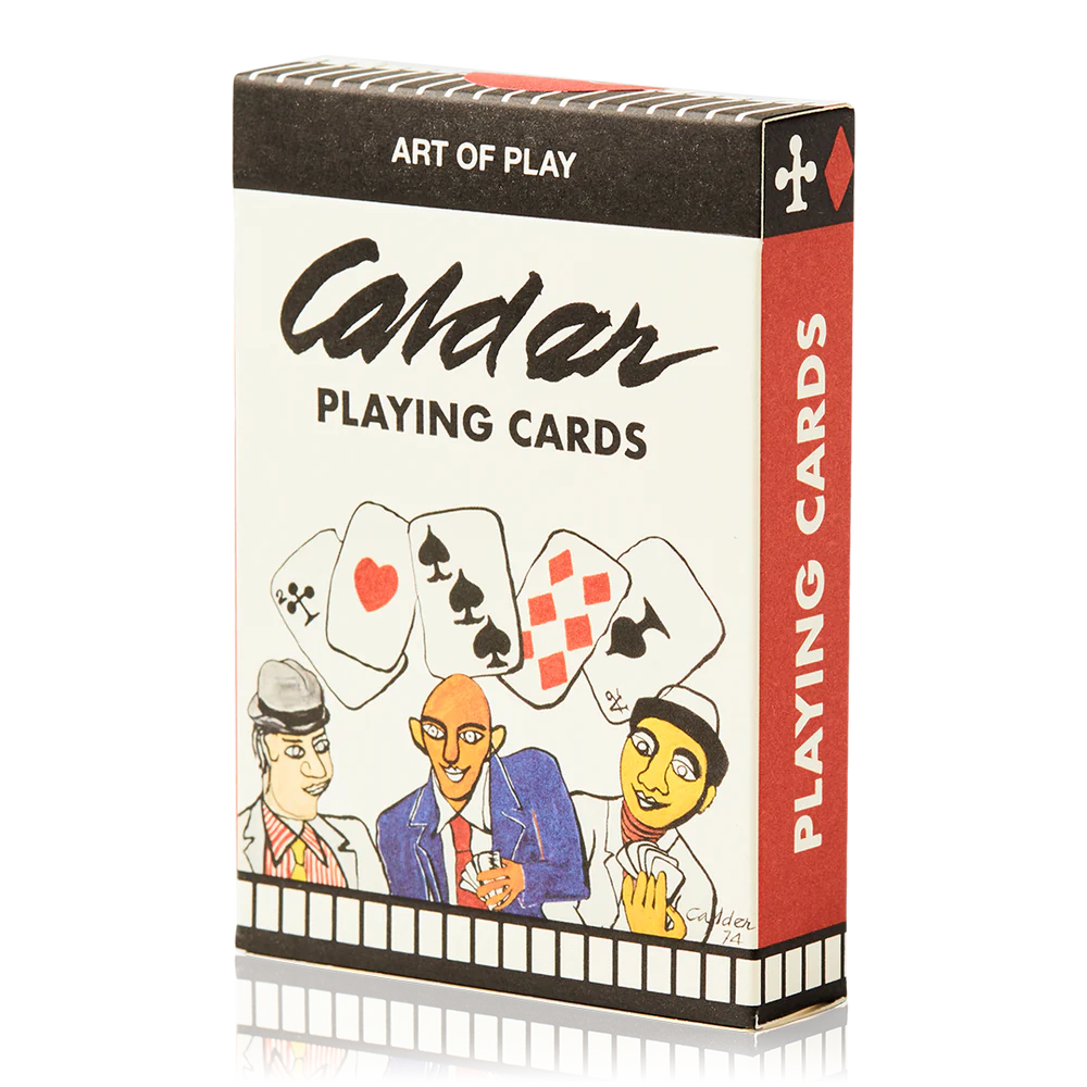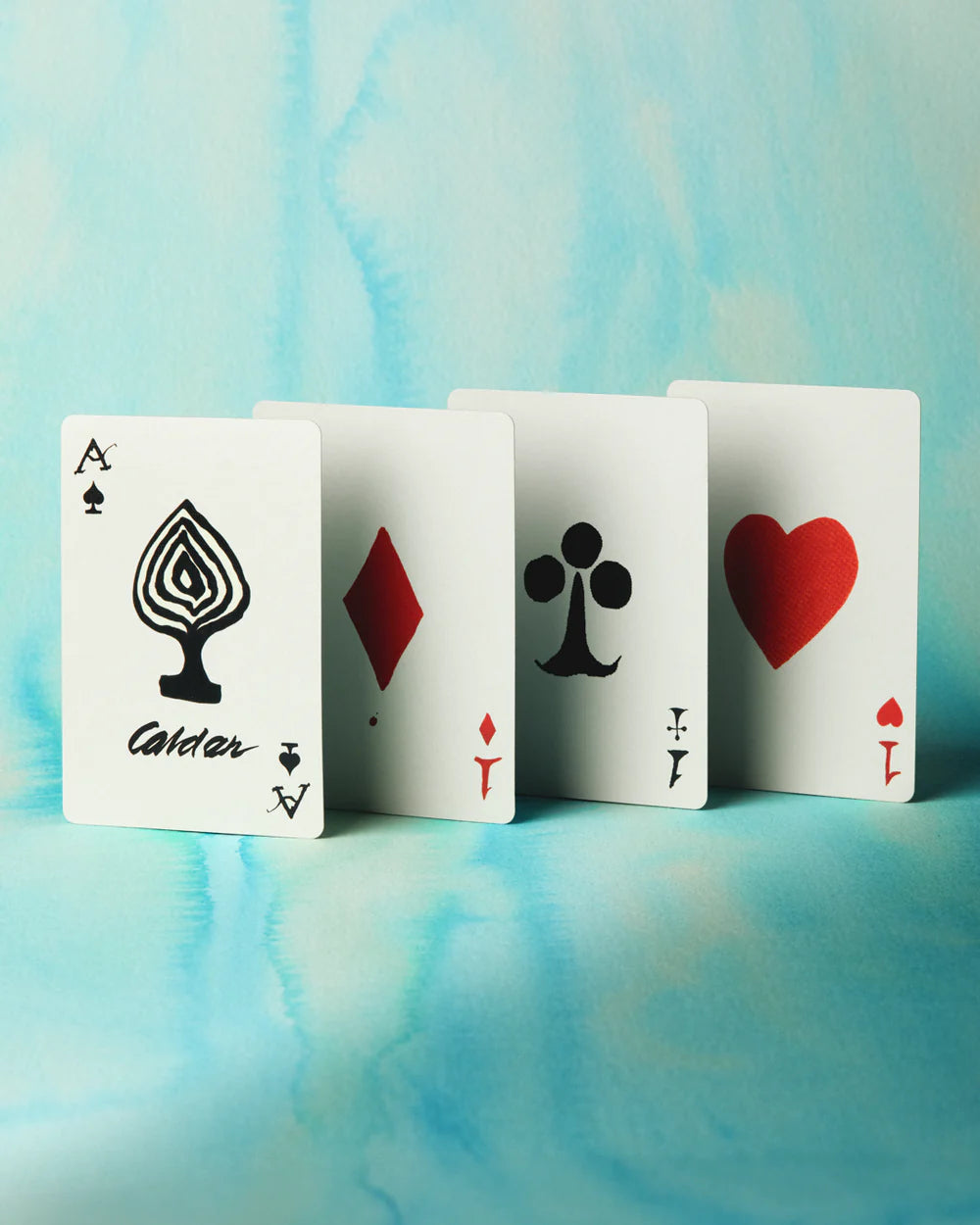 Calder Playing Cards are based on a set of vivid gouache paintings from the 1970s known as the Card Player series. Many of the cards are direct reproductions from those paintings, with the striped back also pulled from them. All letters and numbers are in Calder’s own handwriting.