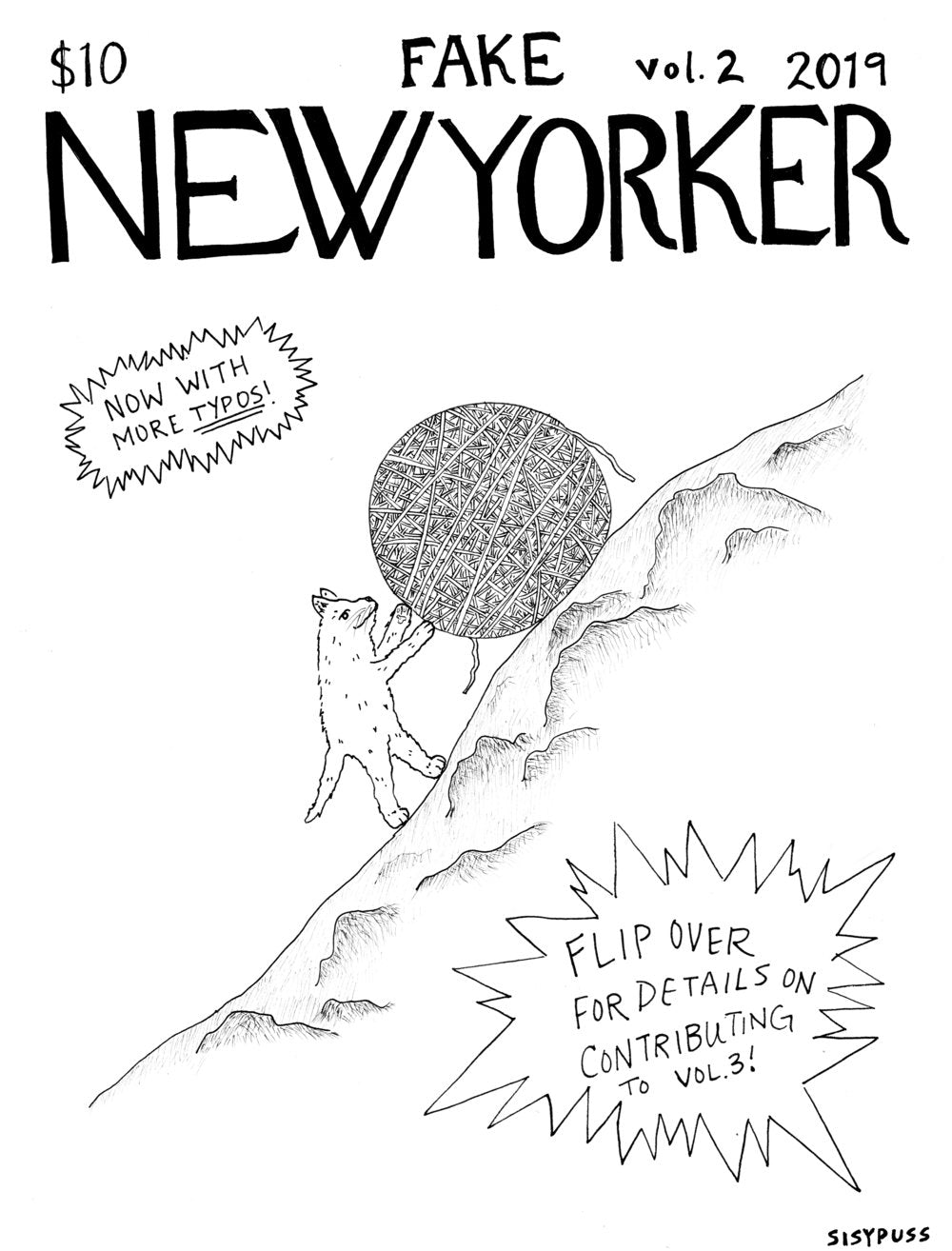 Fake New Yorker magazine, written and illustrated by Baltimore artist, Carrie Rennolds, features absurdist comics, poetry, and reviews with a feminist perspective. Going beyond simple parody, Rennolds' work subtly takes on difficult subjects with quick witted humor, achieving a paradoxical confidence in self-consciousness. Although not a work of collage, Fake New Yorker is as playful, culturally layered and anarchistic, in the vein of Mad Magazine and Dada. The magazine devotes itself to the genius of cartooning and comics—featuring all the subversive power that an illustration has to express self doubt, paranoia, anger, humor and existential daydreaming. Plus cats and dinosaur illustrations.