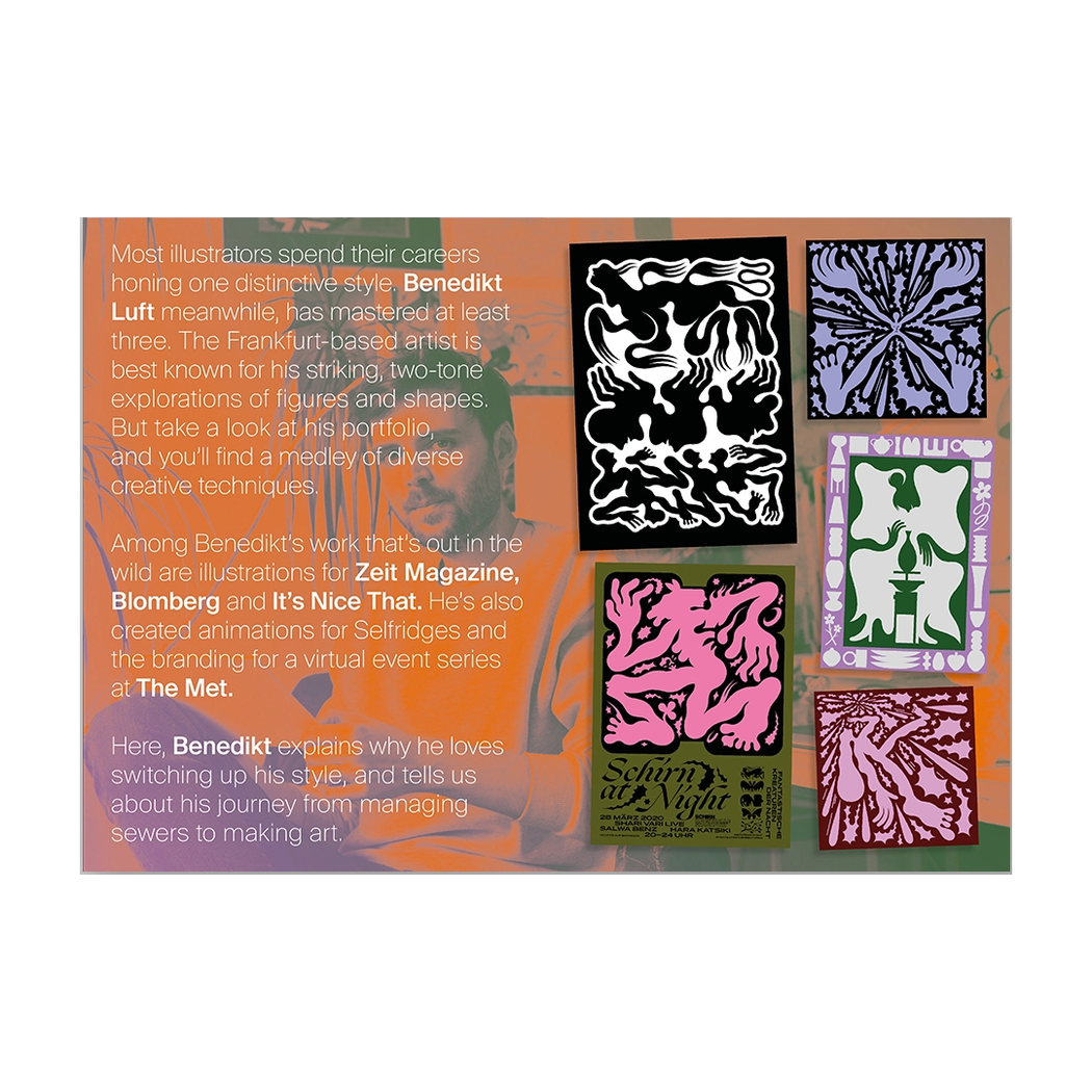 Among Benedikt’s work that’s out in the wild are illustrations for Zeit Magazine, Blomberg and It’s Nice That. He’s also created animations for Selfridges and the branding for a virtual event series at The Met.