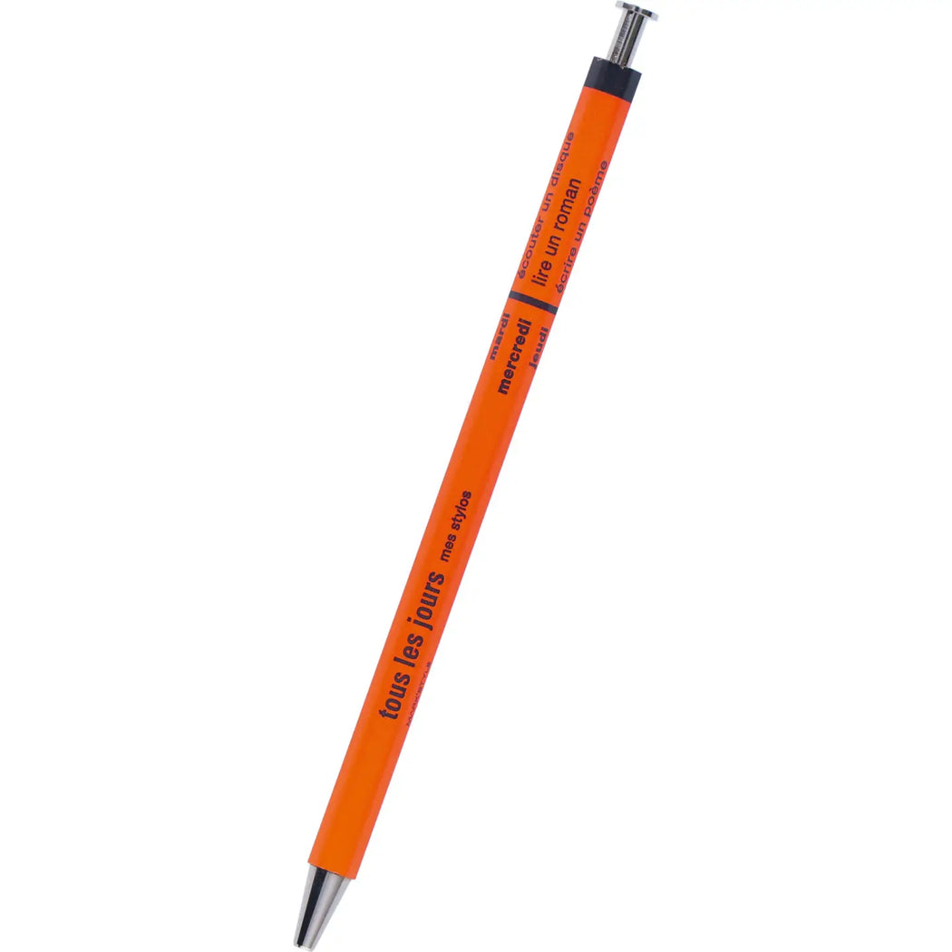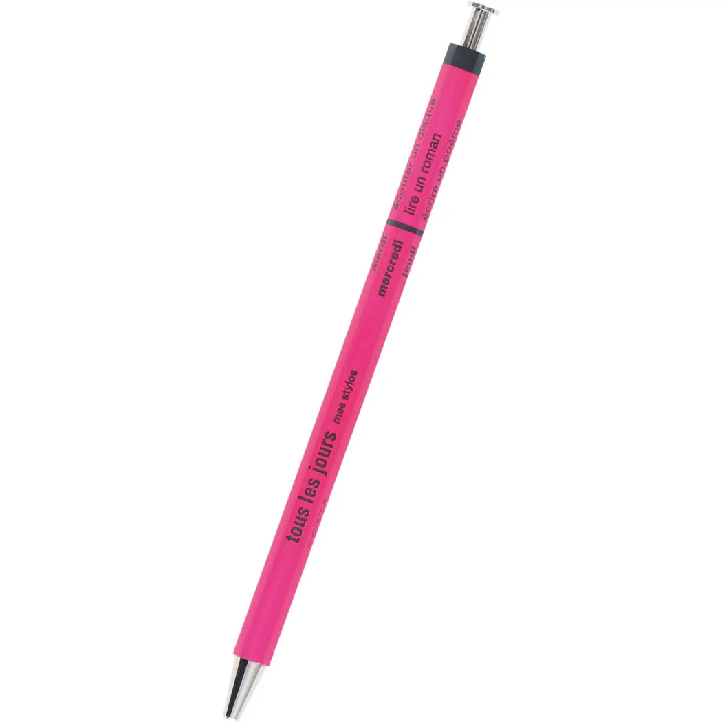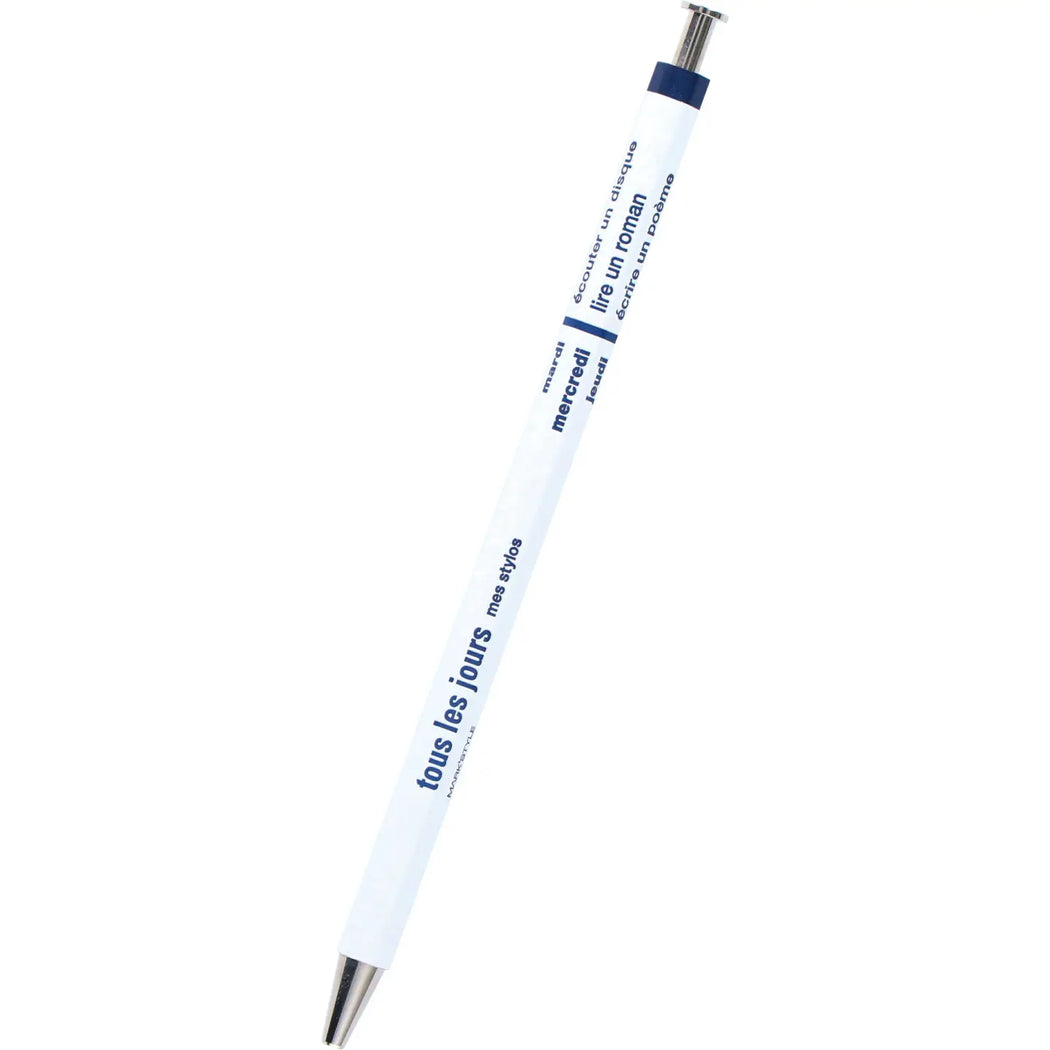 This colorful, vintage-style ballpoint is a stylish addition to your pen case. The pen's hexagonal barrel is made of smooth wood, and each side features a fun daily task in French, such as watching a movie, reading a book, and writing a poem.