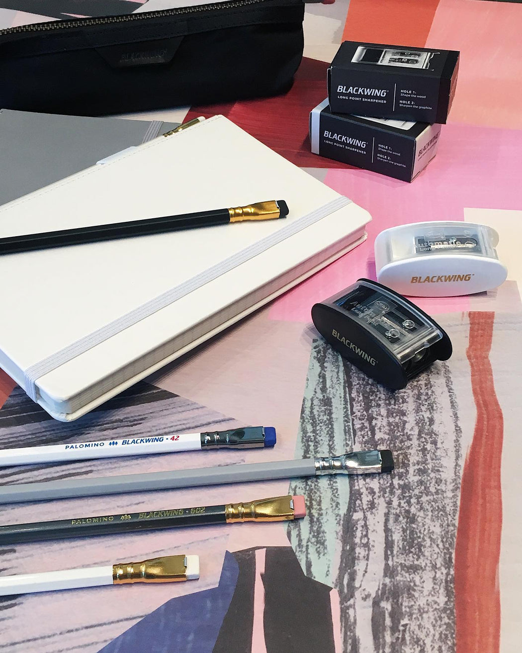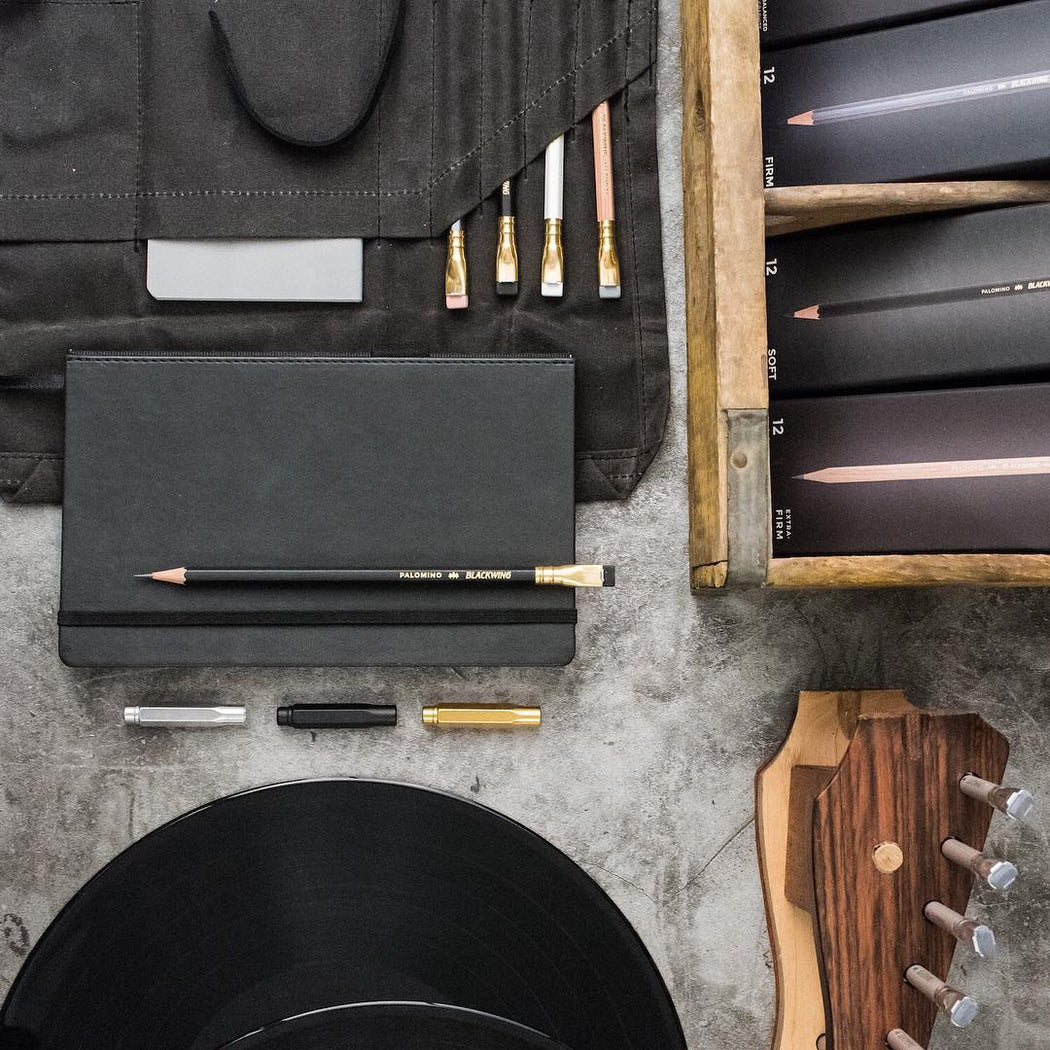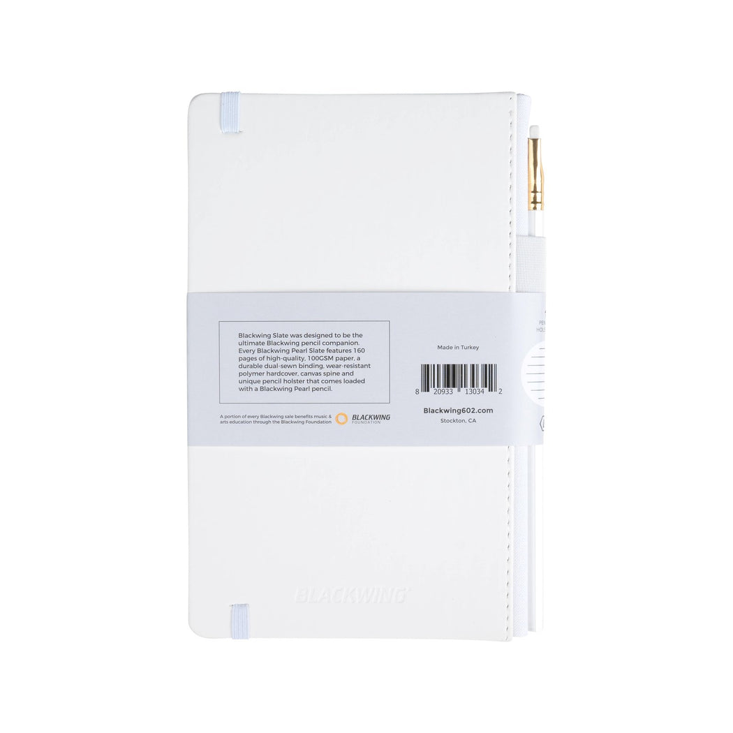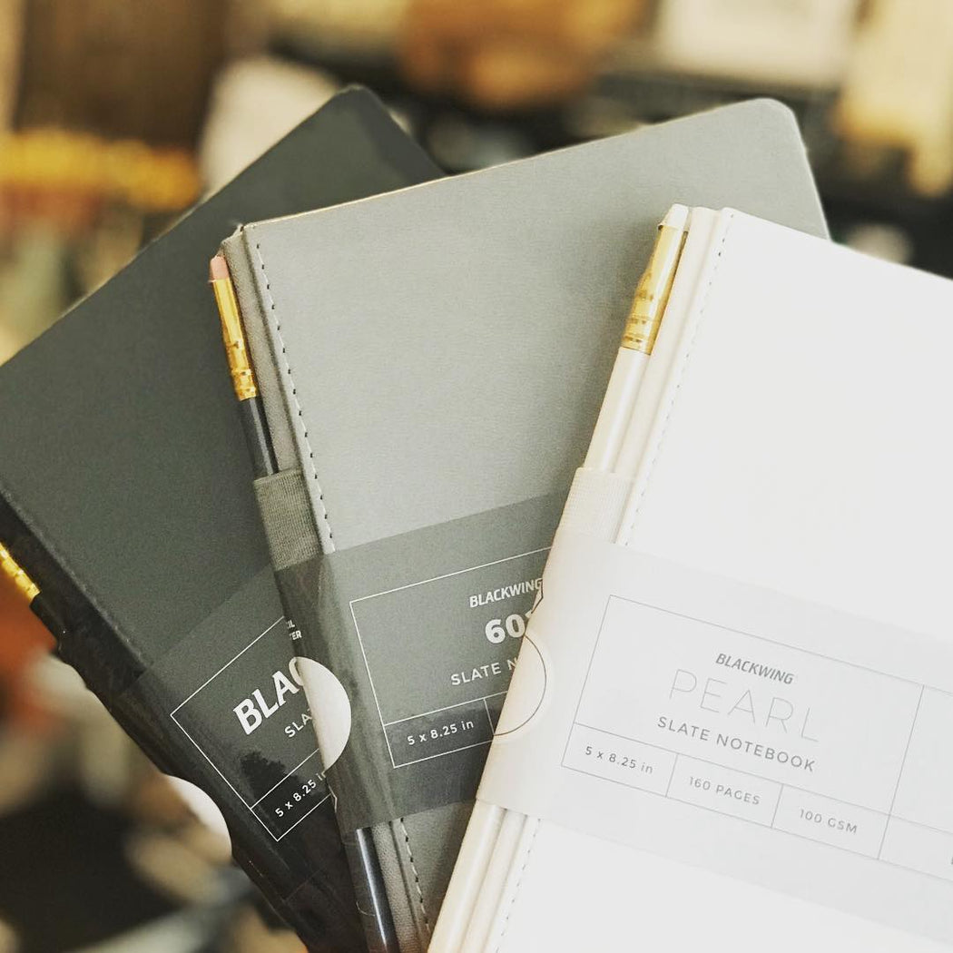 The Blackwing Slate features 160 pages of high-quality, 100GSM paper, a durable dual-sewn binding, wear-resistant matte black hardcover, canvas spine and unique pencil holster that comes loaded with a Blackwing pencil. The Blackwing Slate is available with a Black, Gray or Pearl (white) leather cover.