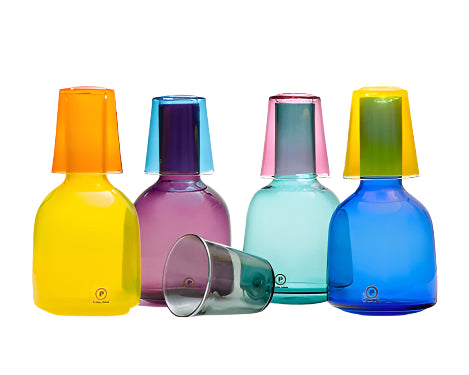 This carafe and cup in gorgeous jewel tones will brighten up any bedside table or desk!  Pick one of our signature color sets or mix and match to create your own unique combination.  Little details make this set a must have!  The transparent cup fits on top of the carafe, creating a wonderful saturation of color where the two objects overlap.   Both the carafe and cup appear to float above any surface due to a slight lift at their bases, making this beautifully functional object seem lighter than air.