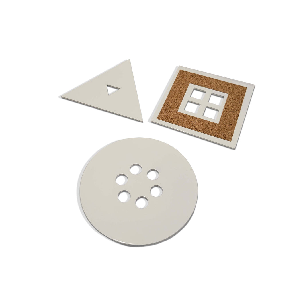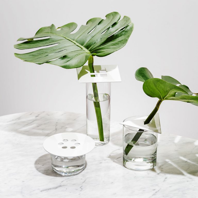 This set of 3 playfully simple shapes instantly transforms everyday vessels into vases. From a single stem to a full bouquet, the shapes and openings are designed to accommodate a variety of flowers and foliage. Steel and cork provides weight and grip, to lift, support, and display stems.