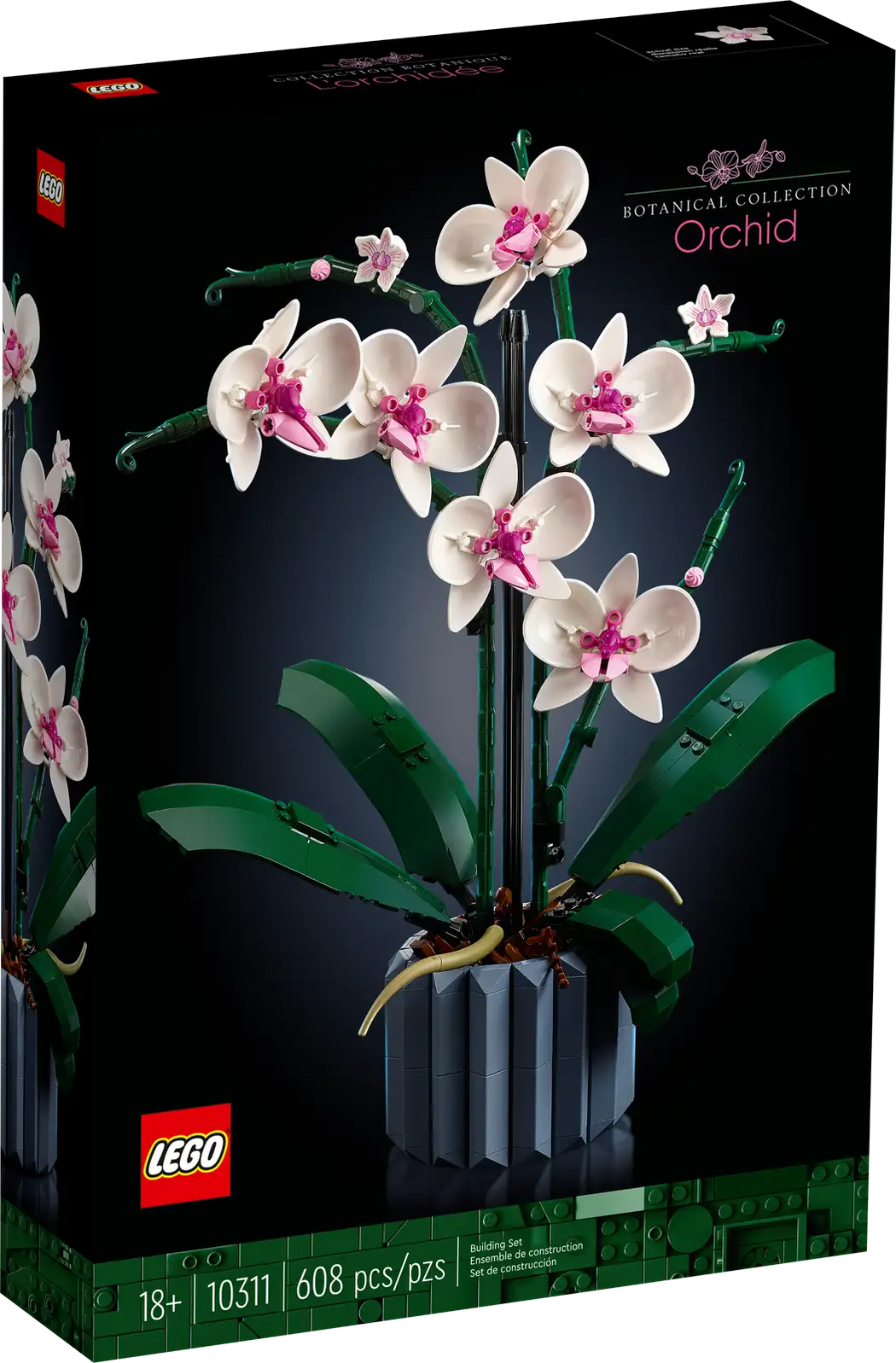 Enjoy a mindful building project and create a beautiful plant display for your home with this LEGO® Orchid (10311) model building project for adults. Take your time crafting all the details of the white and pink flowers and the vase. Inspired by a real orchid, the model has 5 leaves at the base and 2 wandering air roots to create an authentic display. Build the blue fluted vase and fill it with the brown LEGO elements to recreate the bark mix that a real orchid would grow in.