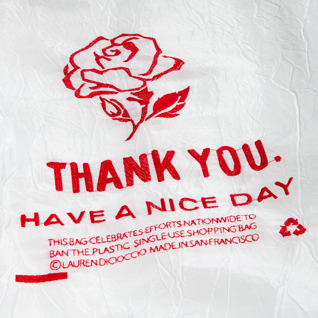 The ROSE TOTE tote is machine-embroidered on fabric made from 100% recycled materials. The totes are sturdy and washable, intended for daily use.