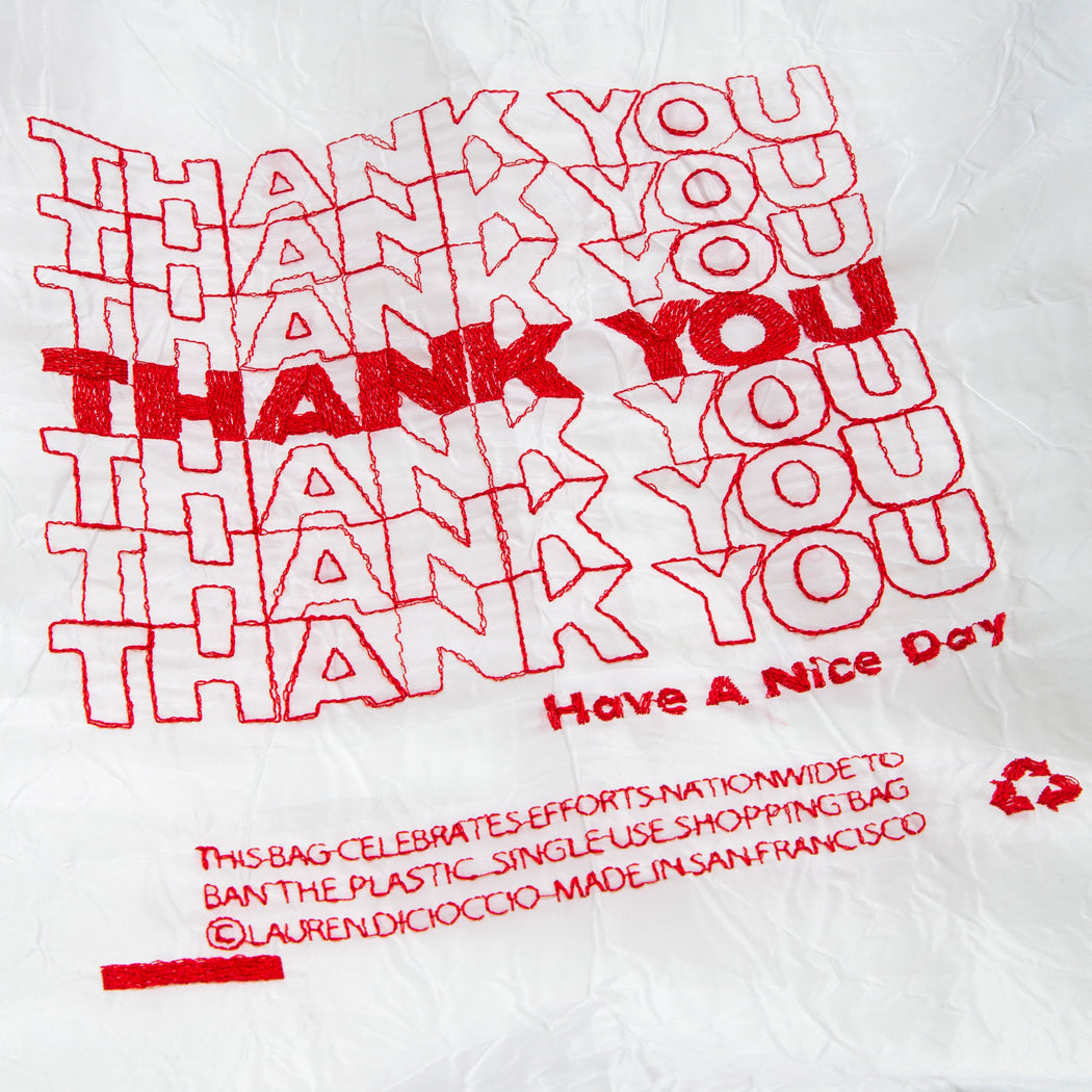The THANK YOU THANK YOU TOTE is machine-embroidered on fabric made from 100% recycled materials. The totes are sturdy and washable, intended for daily use.